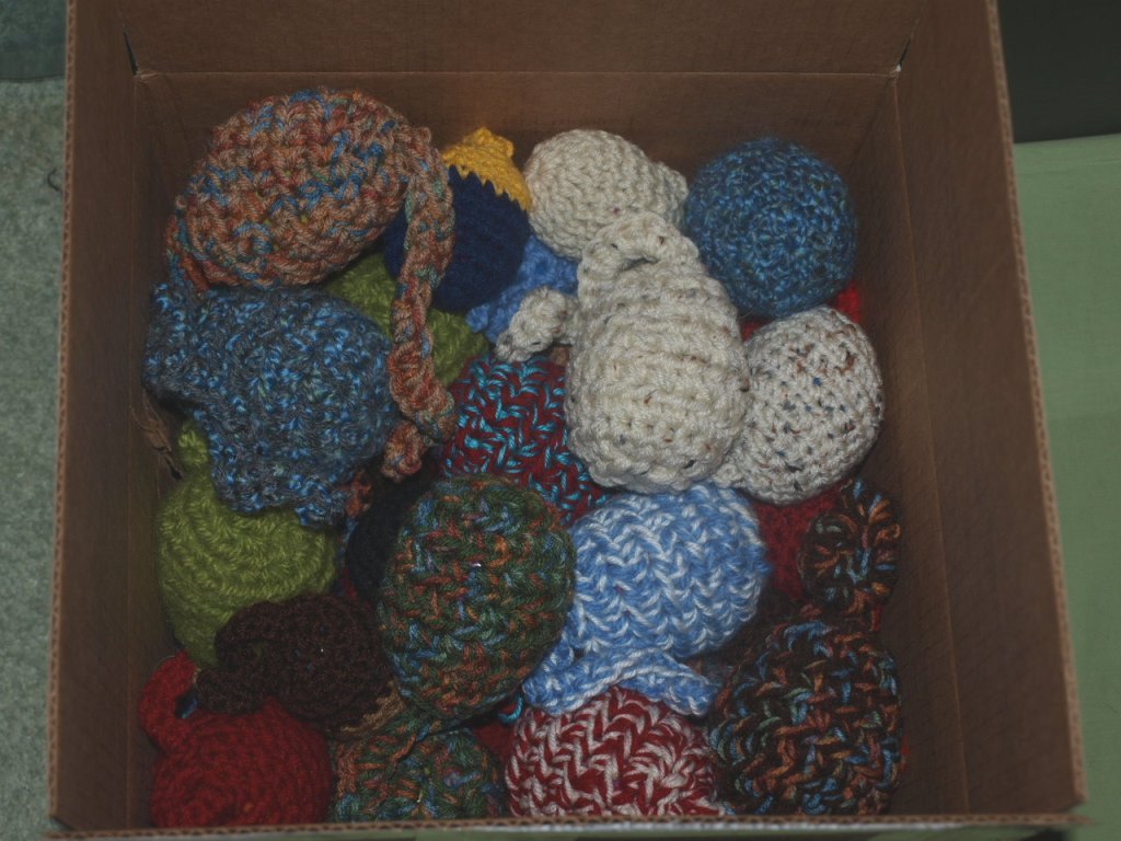 MFirecracker toys (clean vitamin bottles w/ rice or bell, wrap and tie fleece/flannel outside)