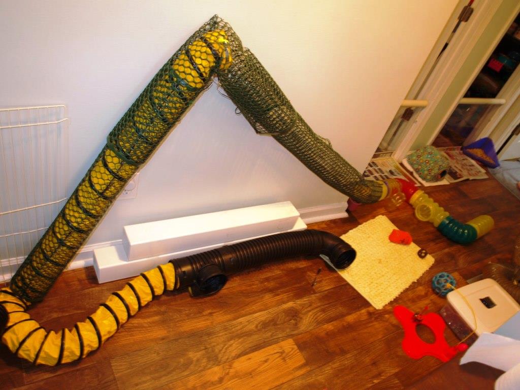 Tubes to run through (clear plastic ferret tubing, long cardboard tubes [free from Lowe's or Home Depot in the carpet department], plastic ridged underground drainage tubing (cheap at the hardware store).