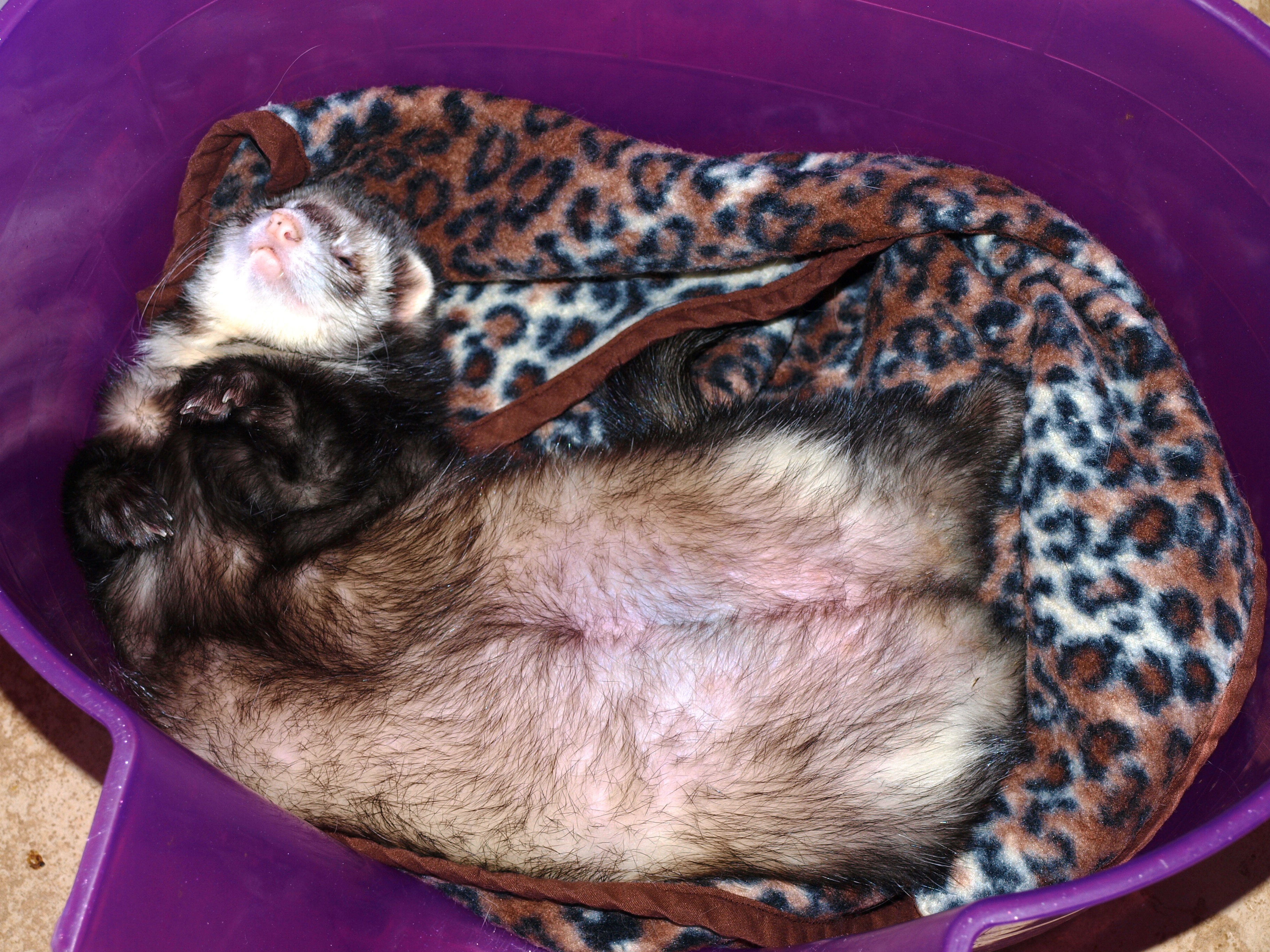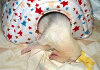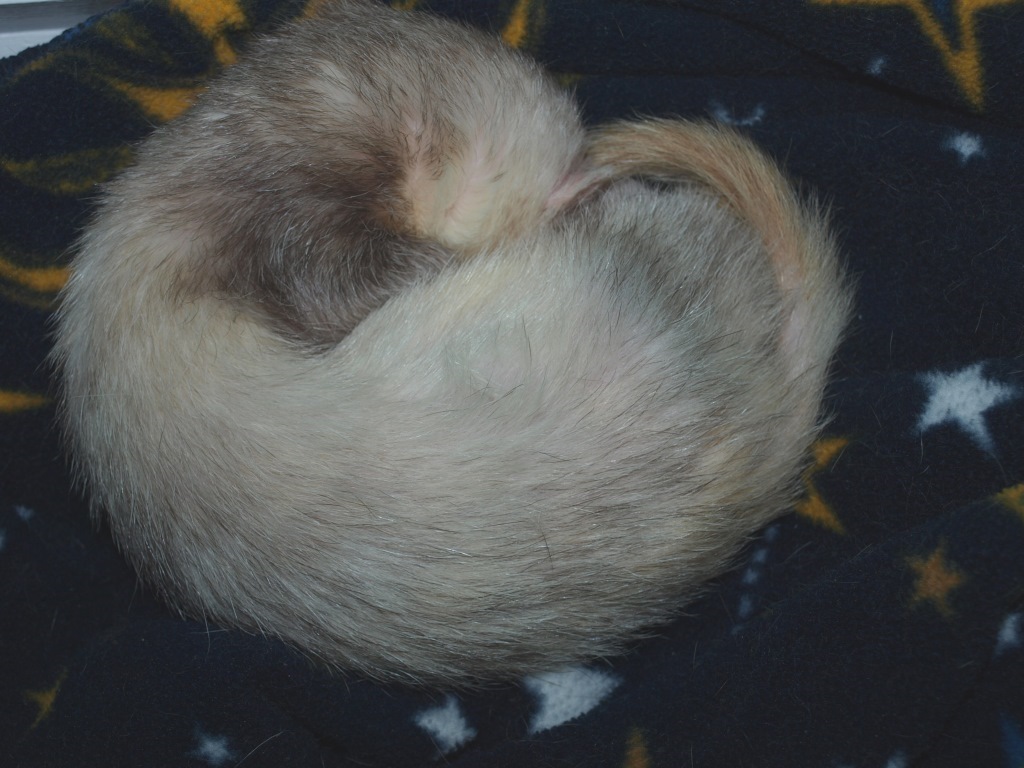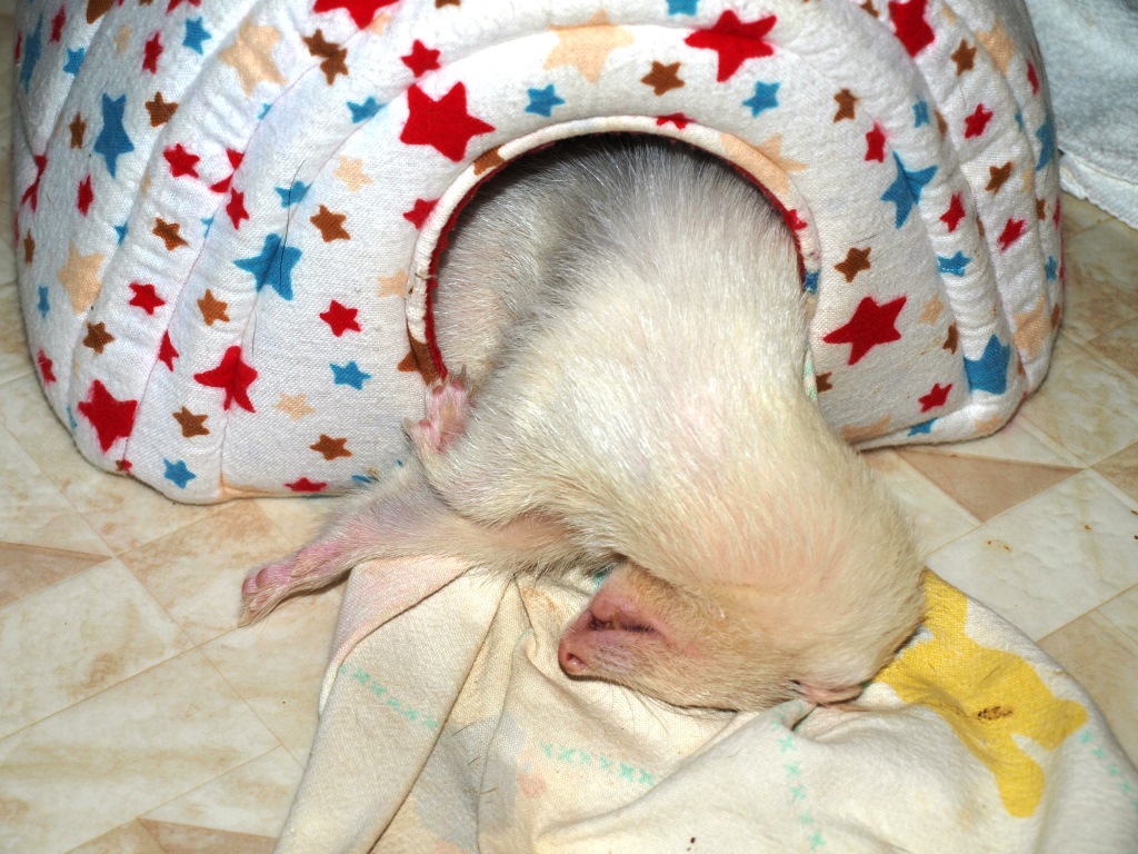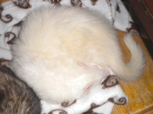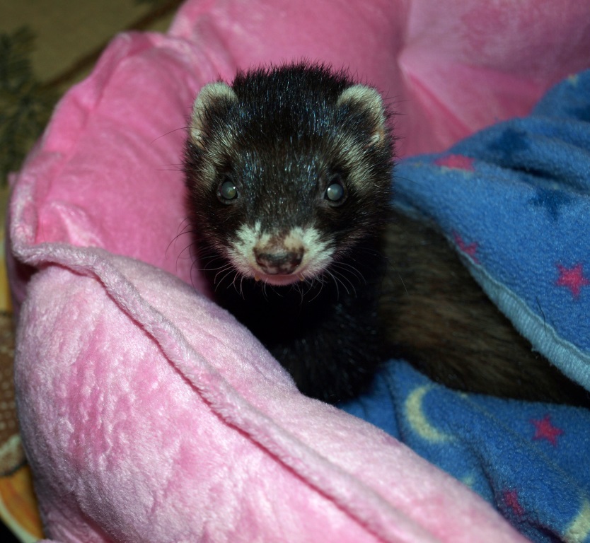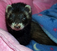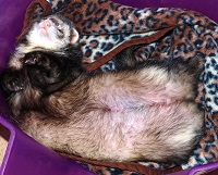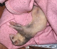 Baby Girl is a hospice and looking for foster home. She is seven years old and mostly blind from cataracts. She has adrenal disease and gets melatonin implants every four months as treatment. She doesn't associate with other ferrets at all. She has her favorite super soft pink bed. She loves soup! She'll eat soup any time I give it to her. She shouldn't be in a home with children or other pets. |