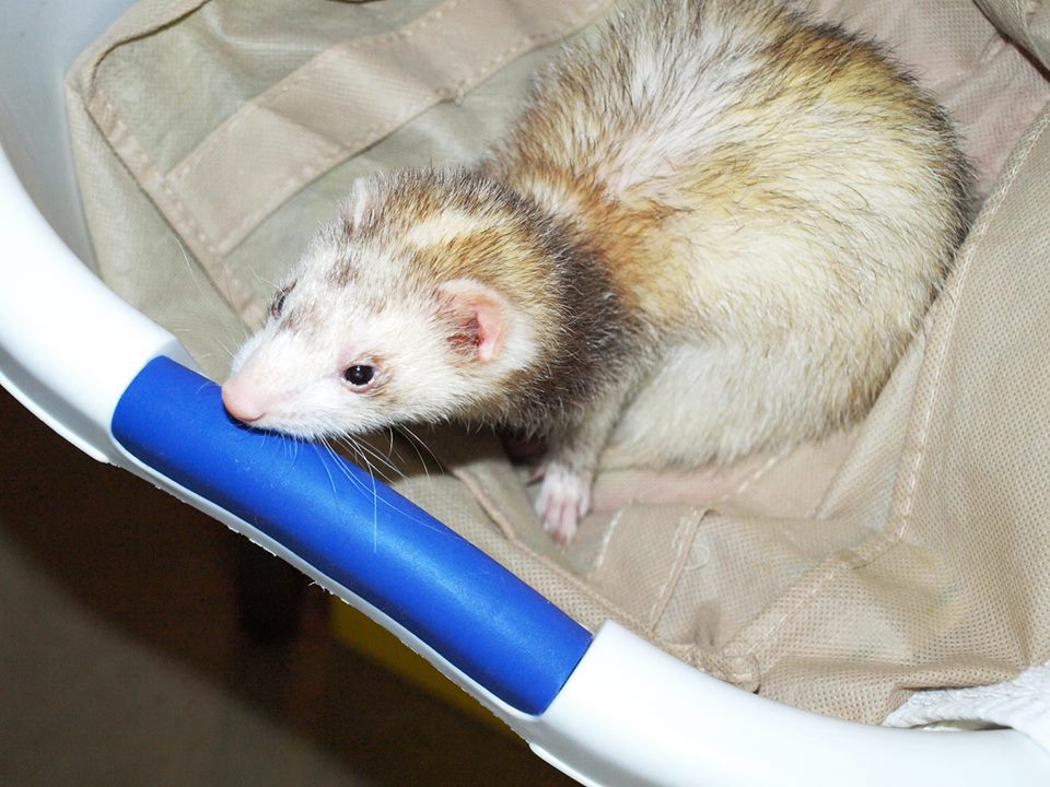 Snowball is a hospice ferret and looking for a foster home. She is about seven years old. She has adrenal disease and lymphoma. She doesn't associate with other ferrets, so needs to go to a home without another ferret or be separated from it. For her age, she still gets up and plays well.